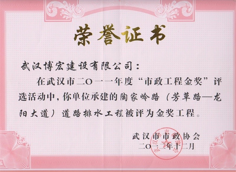 2011年度武漢市市政工程金獎(陶家?guī)X路道路排水工程)