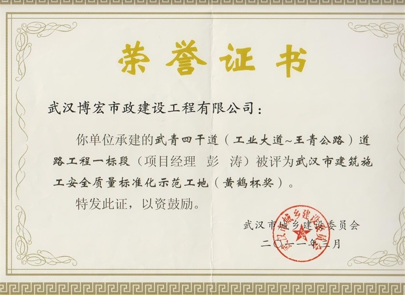 2011年度武漢市建筑施工安全質(zhì)量標(biāo)準(zhǔn)化示范工地黃鶴杯獎(武青四干道道路工程一標(biāo)段)