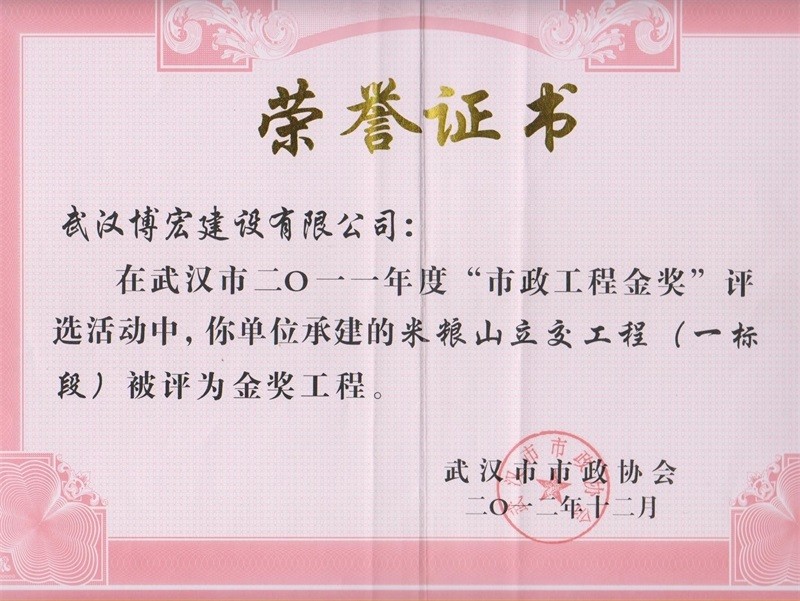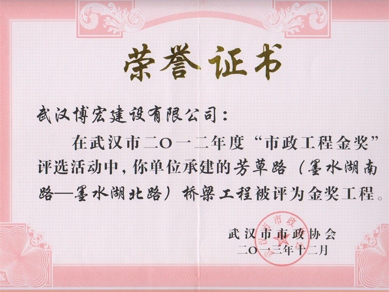 2012年度武漢市市政工程金獎(芳草路橋梁工程)
