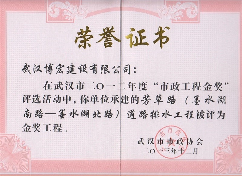 2012年度武漢市市政工程金獎(芳草路道路排水工程)