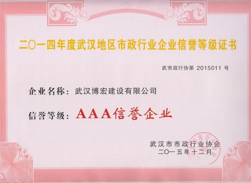 2014年度武漢地區(qū)市政行政企業(yè)信譽等級證書