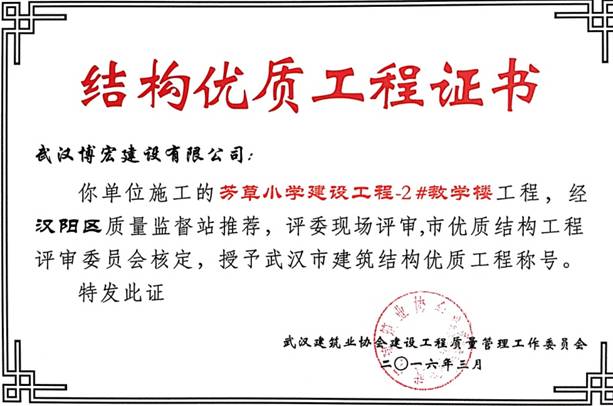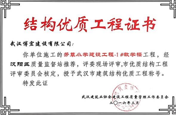 我單位施工的芳草小學(xué)建設(shè)工程(芳草路與四新北路交匯處西北角)1#教學(xué)樓、2#教學(xué)樓、教學(xué)綜合樓工程,經(jīng)漢陽(yáng)區(qū)建筑管理站推薦,評(píng)委現(xiàn)場(chǎng)評(píng)審,武漢建筑業(yè)協(xié)會(huì)建設(shè)工程質(zhì)量管理工作委員會(huì)核定,授予武漢市建筑結(jié)構(gòu)優(yōu)質(zhì)工程稱號(hào)。