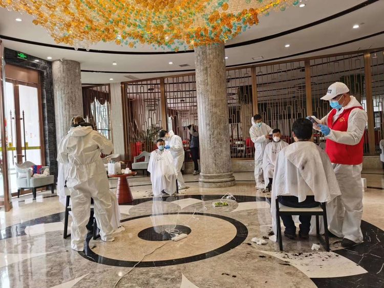目前正值疫情防控決戰(zhàn)階段,為了確保整個(gè)理發(fā)過程安全有序,此次理發(fā)活動(dòng)選在公司防疫項(xiàng)目建設(shè)人員集中居住的紐賓凱大酒店,志愿者們均由公司指派專人開車提前1個(gè)小時(shí)從漢陽、漢口接至酒店,進(jìn)入大堂之前,所有人員均進(jìn)行了體溫檢測(cè),并分發(fā)口罩,理發(fā)開始后則按照每四人一組進(jìn)行輪換理發(fā),避免人員集中。整個(gè)理發(fā)過程持續(xù)了近4個(gè)小時(shí),在4位理發(fā)師的精心打理下,70余名項(xiàng)目一線人員從“油膩大叔”秒變“帥氣小伙”。