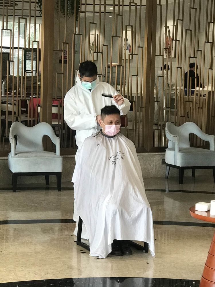 “麻煩幫我剪短點(diǎn),再剪短點(diǎn),兩個(gè)月沒理過發(fā)了,頭發(fā)從來沒這么長(zhǎng)過!”3月8日上午10點(diǎn),搬來幾張椅子、拿上幾把剪發(fā)器,“臨時(shí)理發(fā)店”在紐賓凱酒店大堂正式開業(yè)。