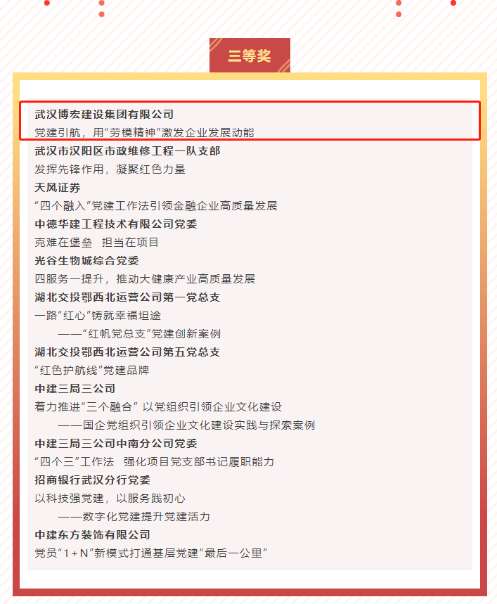 ? ? ? ?近日,首屆新時代企業(yè)黨建創(chuàng)新案例獲獎名單公布,由博宏建設(shè)集團推送的《黨建引航,用“勞模精神”激發(fā)企業(yè)發(fā)展動能》品牌案例斬獲黨建優(yōu)秀案例三等獎。?該項活動由湖北省新時代文明實踐研究院、華中科技大學(xué)馬克思主義學(xué)院、華中科技大學(xué)黨的建設(shè)研究中心聯(lián)合紅艦智庫等機構(gòu)共同發(fā)起,博宏建設(shè)集團推送的品牌案例在百余項案例中脫穎而出。
