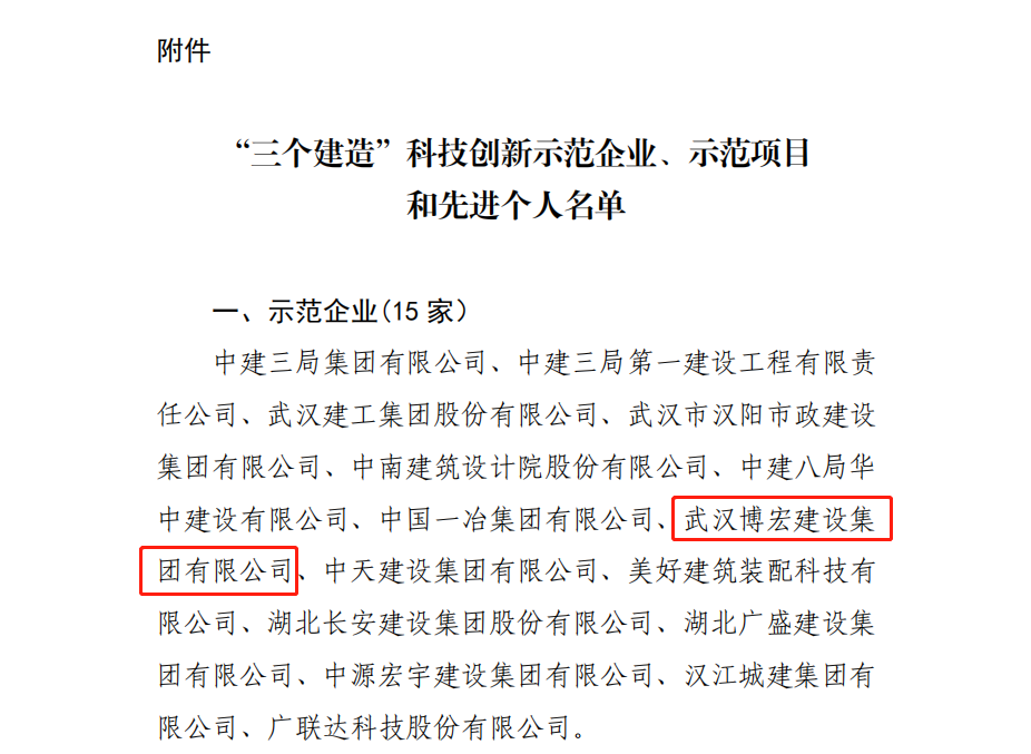 12月28日湖北省住房和城鄉(xiāng)建設(shè)廳發(fā)布關(guān)于綠色建造智能建造品質(zhì)建造科技創(chuàng)新工作情況的通報(bào),博宏建設(shè)集團(tuán)入選“三個(gè)建造”科技創(chuàng)新示范企業(yè);漢陽市政建設(shè)大廈(一標(biāo)段)、新建商務(wù)服務(wù)與設(shè)施項(xiàng)目(中南科研設(shè)計(jì)中心)項(xiàng)目入選“三個(gè)建造”科技創(chuàng)新示范項(xiàng)目;嚴(yán)俊、楊云華入選“三個(gè)建造”科技創(chuàng)新先進(jìn)個(gè)人。