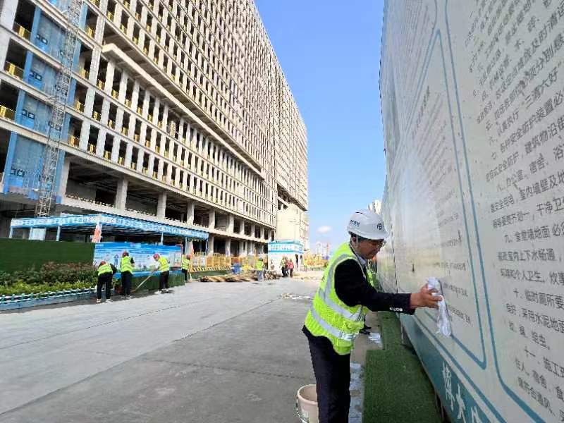 針對(duì)辦公區(qū),作業(yè)區(qū)和生活區(qū)施工環(huán)境的薄弱環(huán)節(jié),區(qū)建筑管理站工作人員與項(xiàng)目現(xiàn)場(chǎng)人員一起拿起掃帚、拖把、抹布等清潔工具,“擼起袖子”對(duì)綠化、圍擋、路面的環(huán)境衛(wèi)生情況進(jìn)行清潔整治,以查漏補(bǔ)缺的方式做好項(xiàng)目文明施工的細(xì)節(jié),不留一處死角,杜絕“臟、亂、差”現(xiàn)象,實(shí)打?qū)嵵?xiàng)目成為清潔工地。