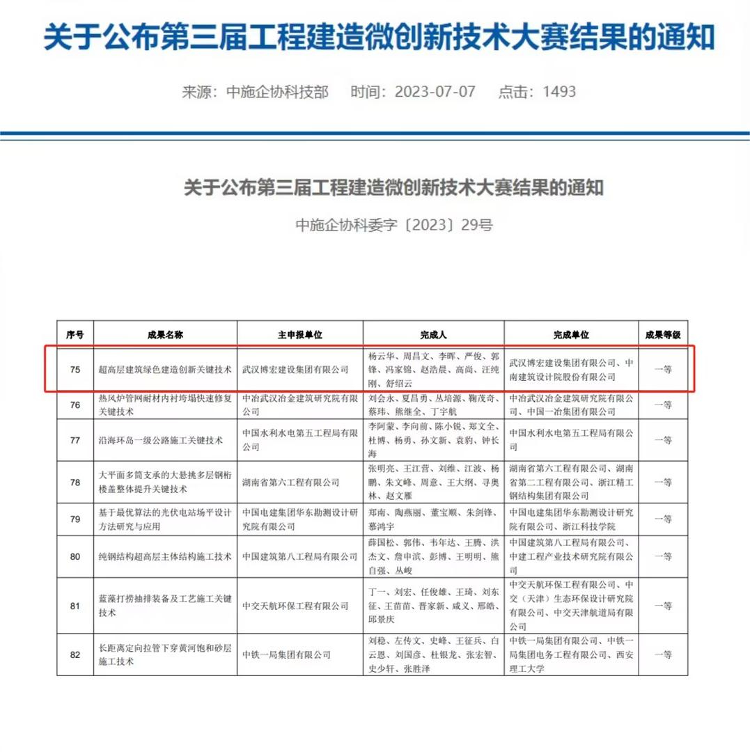 近日,中國施工企業(yè)管理協(xié)會公布第三屆工程建造微創(chuàng)新技術(shù)大賽獲獎結(jié)果。以中南科研設(shè)計中心建設(shè)項目為背景的“超高層建筑綠色建造創(chuàng)新關(guān)鍵技術(shù)”榮獲中施企協(xié)第三屆工程建造微創(chuàng)新技術(shù)大賽一等成果,這也是博宏建設(shè)集團(tuán)首次獲得該類賽事一等獎。